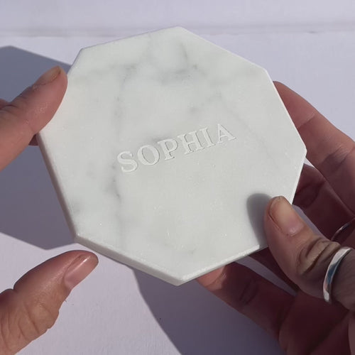 Engraved Wedding White Octagonal Marble Coaster with Metallic Gold In-fill