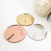 Style up your wedding décor and keep your drinks in place, with round acrylic place cards for your wedding glassware.