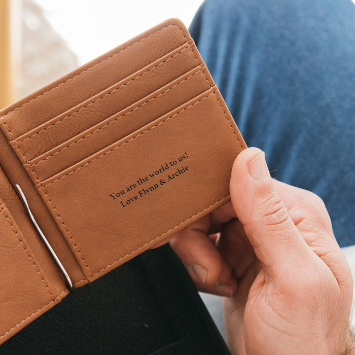 Make it personal by adding his initials, professionally laser engraved onto both the keyring and the front of the wallet. Want to go the extra mile? Include a heartfelt message engraved inside the wallet - so every time he opens it, he’s reminded of how much he means to you.